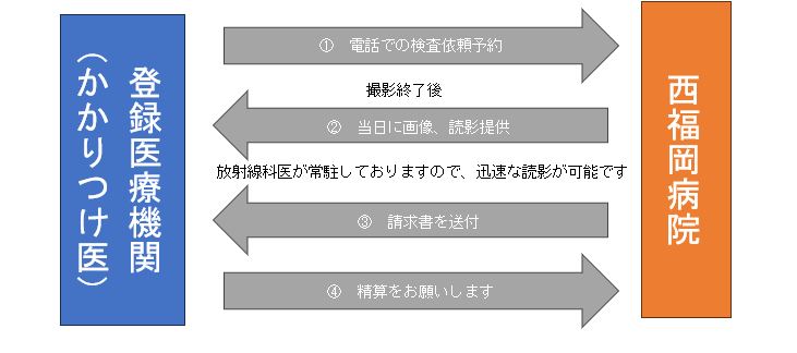 ① ご依頼元の医療機関から当院の放射線科へ電話(092-881-1559)をいただき、検査予約をする。